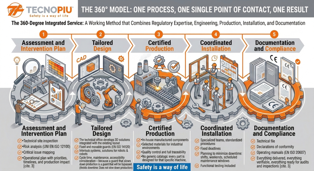 The integrated 360-degree service was created precisely to eliminate these scenarios. It is not a commercial package: it is a working method that brings together regulatory expertise, engineering, manufacturing, installation, and documentation under a single direction.